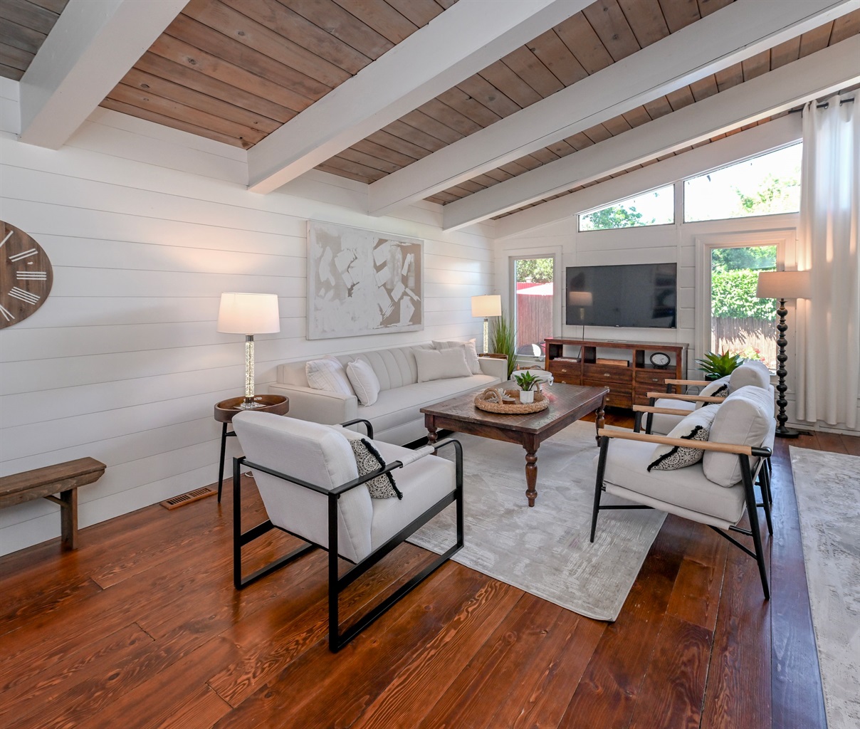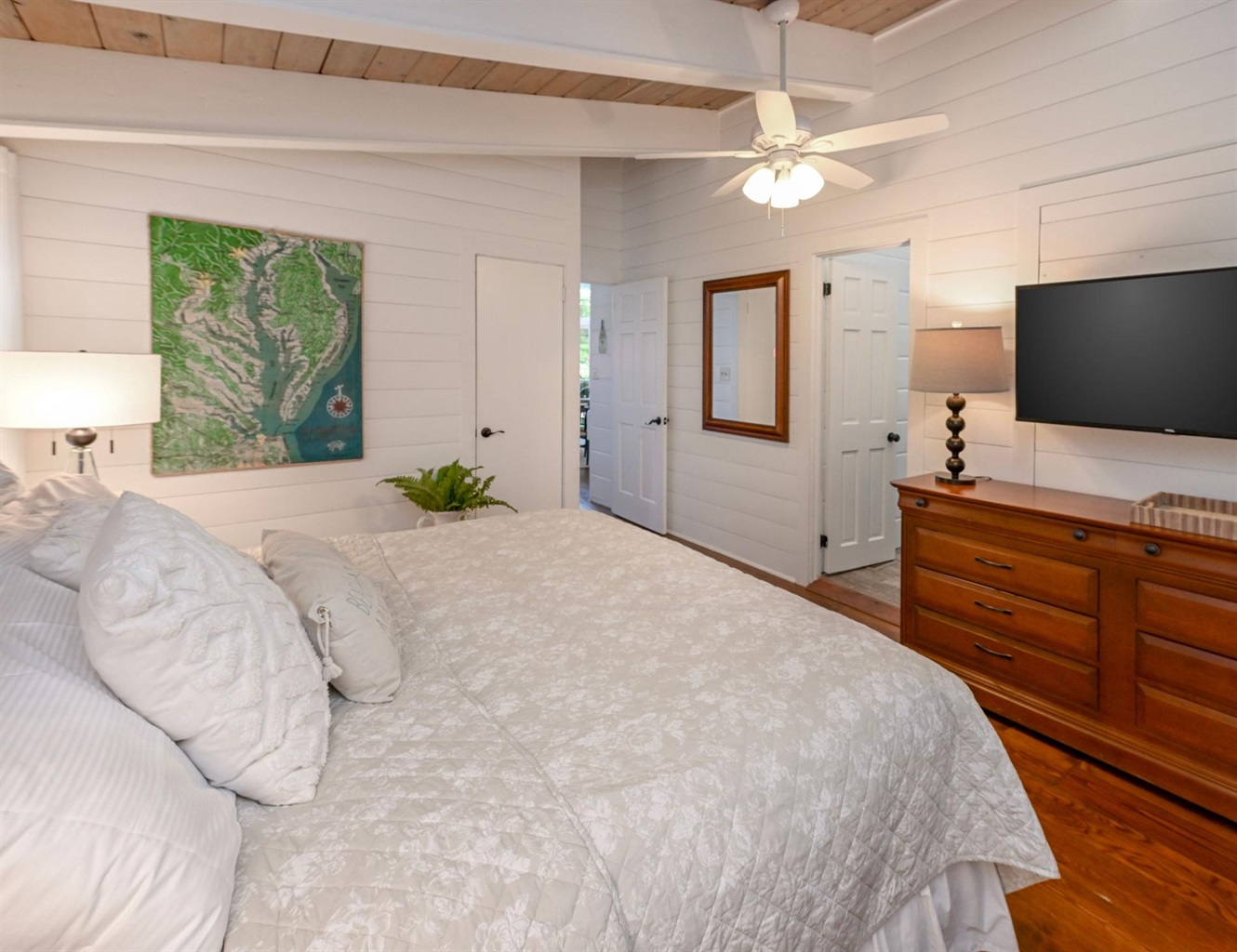 Inside, the home showcases timeless coastal craftsmanship with heart pine floors, custom shiplap walls, and soaring vaulted ceilings that create a light-filled, sophisticated atmosphere. The residence features four well-appointed bedrooms and three full bathrooms, a fully stocked kitchen, and an open-concept living and dining space with seating for ten—perfect for entertaining in style. A bar refrigerator and an electric fireplace make the beautiful living area perfect for entertaining or relaxing.